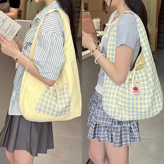 GUCSELECTED(B2497) กระเป๋าสะพายผ้าใบใหญ่ลายสก็อตป้ายมะเขือเทศ ใช้ได้2ด้าน