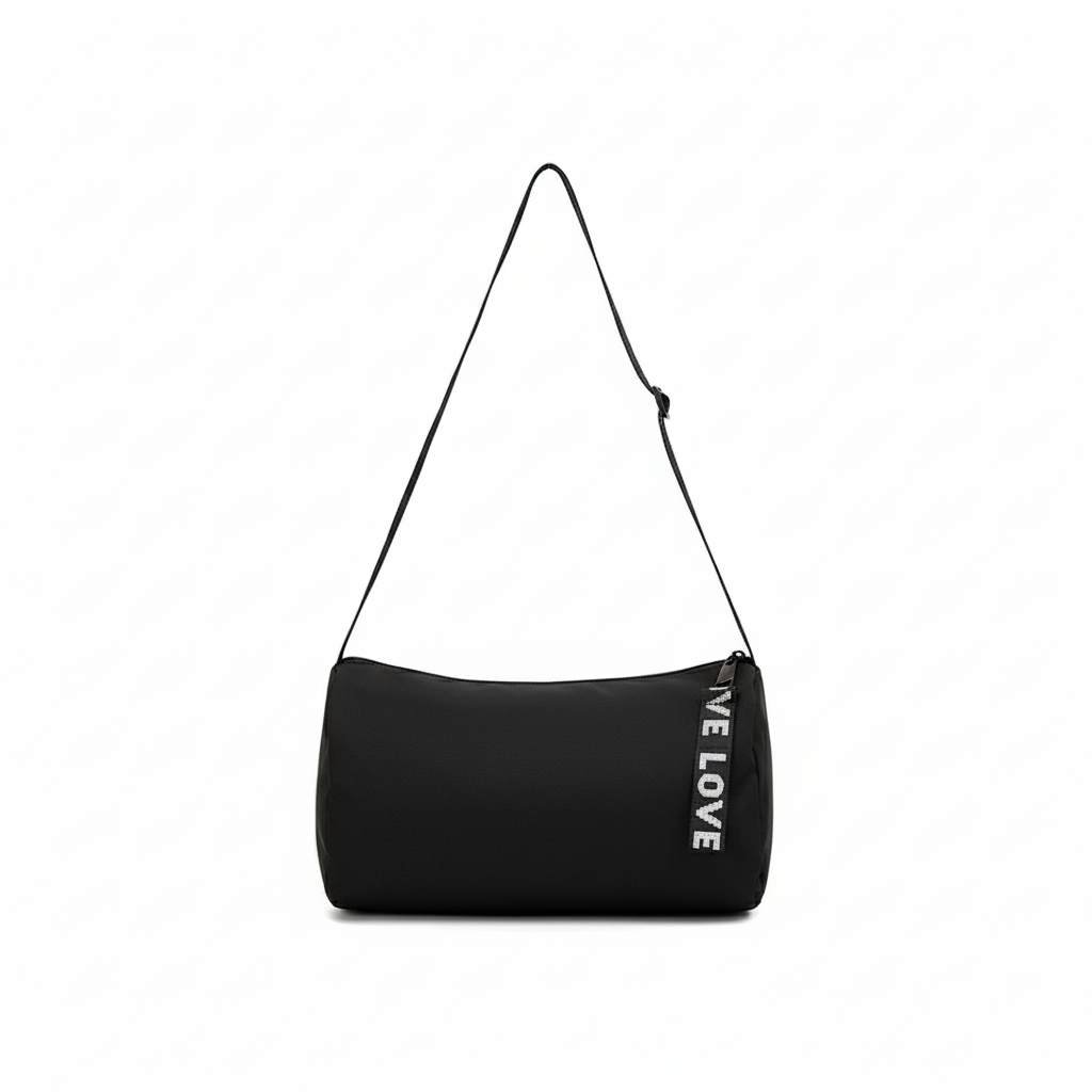 รายละเอียดสินค้า : กระเป๋าสะพายข้างสีดำ ซิปห้อยLOVE ผ้าไนล่อน